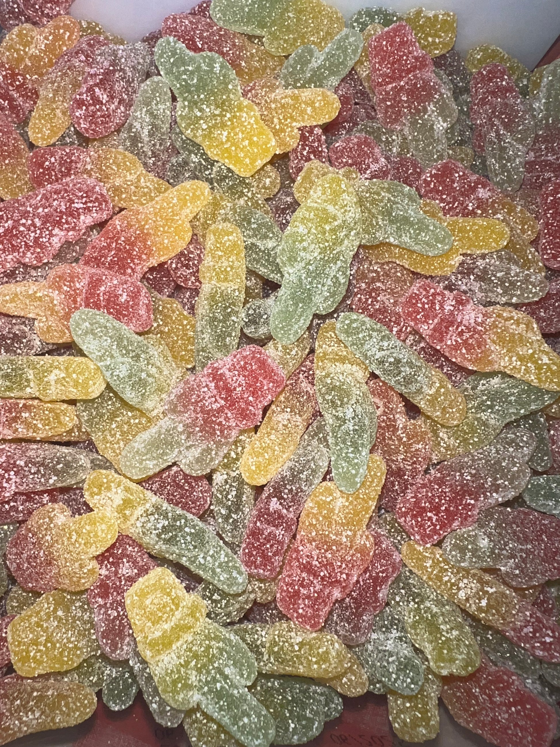 Ingrédients : sirop de glucose, sucre, eau, gélatine, acidifiants : acide citrique, acide malique, correcteur d'acidité : malates de sodium, arômes naturels, arôme naturel de pomme avec autres arômes naturels, concentré colorant de spiruline et de carthame, colorants anthocyanes, curcumine, arôme naturel de citron avec autres arômes naturels, amidon de blé, sirop de glucose : Origine UE.