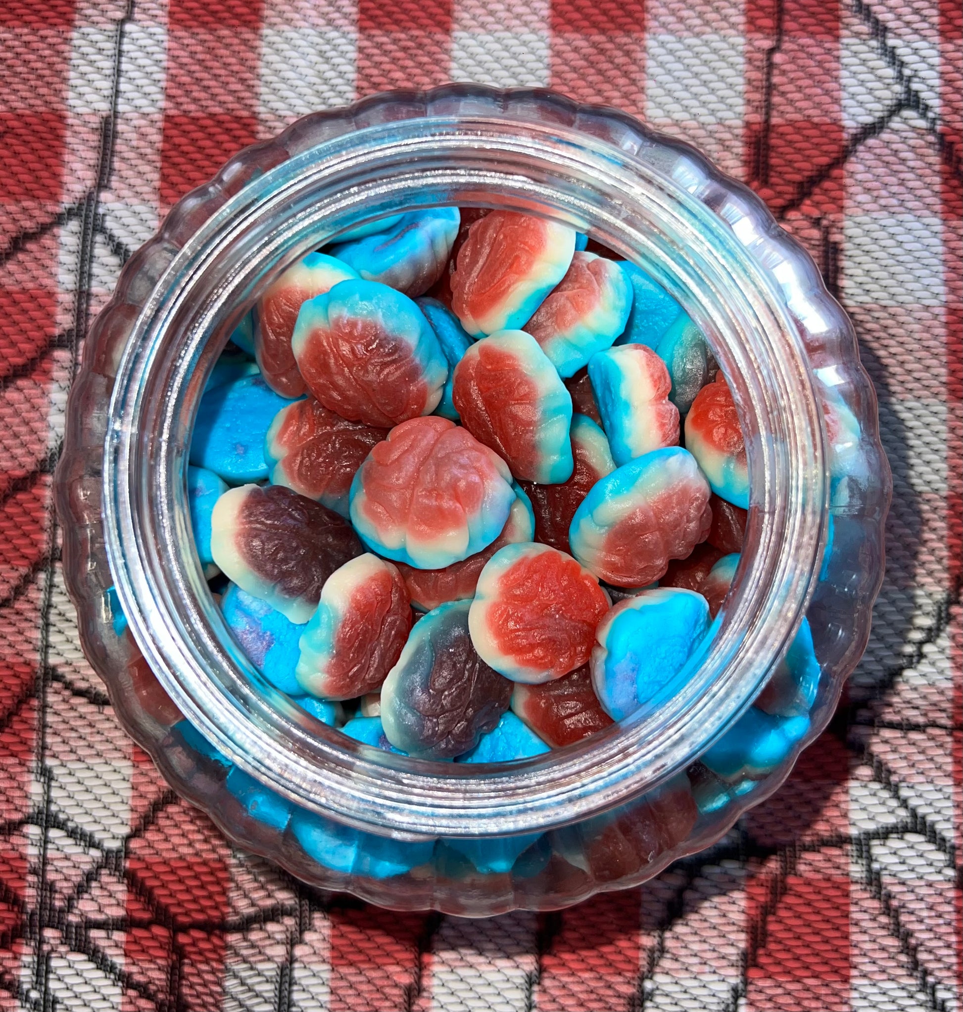 ingrédients : sirop de glucose, sucre , eau, gélatine de bœuf halal, amidon modifié de pomme de terre, acidifiants : E270, E330, arôme artificiel, agent d'enrobage : huile végétale (palme), E901, E903. Colorants : E133, E129. Le E129, peut avoir des effets négatifs sur l'activité et l'attention chez l'enfants.