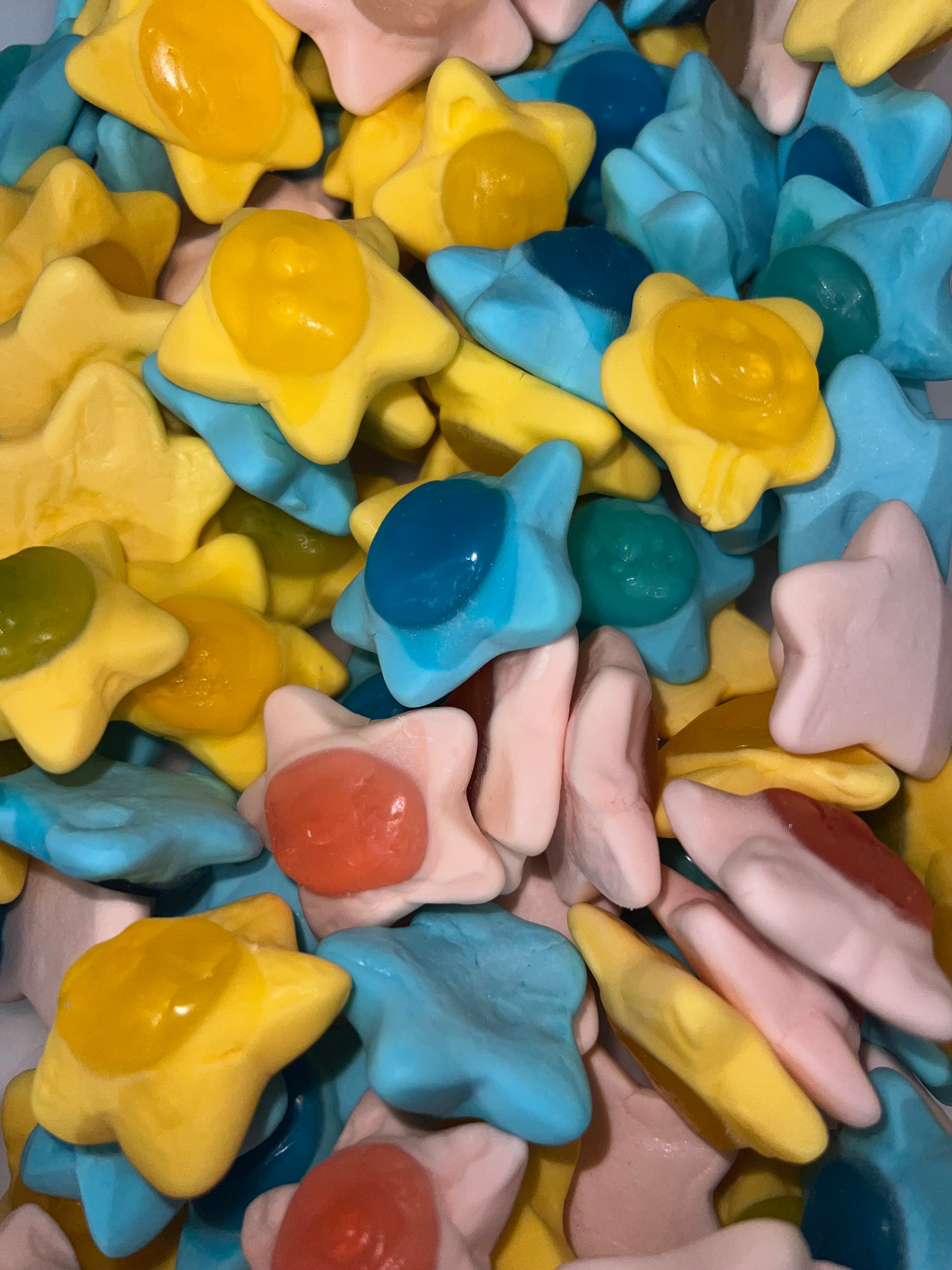 Ingrédients : sucre, sirop de glucose, eau, gélatine, acidifiant (acide citrique), huile de tournesol, arôme, concentrés de fruits et plantes (radis, patate douce, carotte, carthame, groseille noire, hibiscus, spiruline, pomme), colorants (curcumine, bleu brillant FCF), agent de revêtement : cire d’abeille.