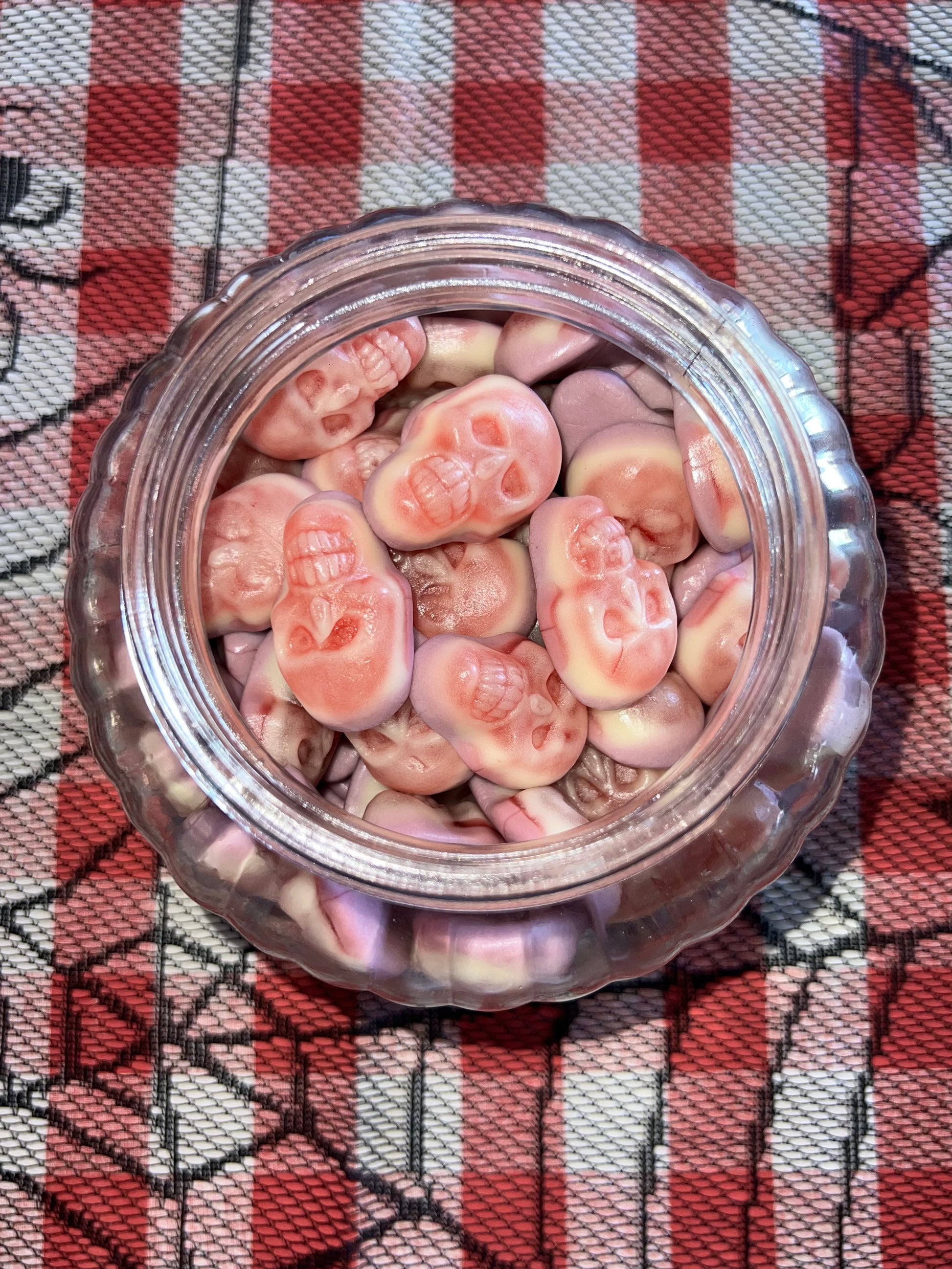 ingrédients : sucre, sirop de glucose, sirop de sucre inverti, gélatine, gélifiant : pectine, amidon, amidon modifié, maltodextrines, dextrose, acidifiants ; acide citrique, acide tartique, acided lactique, acide malique, aicde acétique, protéine de riz hydrolysée , protéine de pomme de terre, humectant, humectant ; glycérol, sorbitols, jus de pomme à base de concentré, correcteur d'acidité : citrates de sodium, malate de sodium, agent d'enrobage ; cire de carnauba , cire d'abeille ; concentrée de végétale : citron, carthame, carotte, cassis, radis, potiron, pomme, tomate, patate douce, cerise, spirulina, hibiscus, sureau, huile d'olive, arômes , colorants : E120, E133. En gélifié dragéifié : épaississeur ; gomme arabique ; agent d'enrobage ; gomme laque.