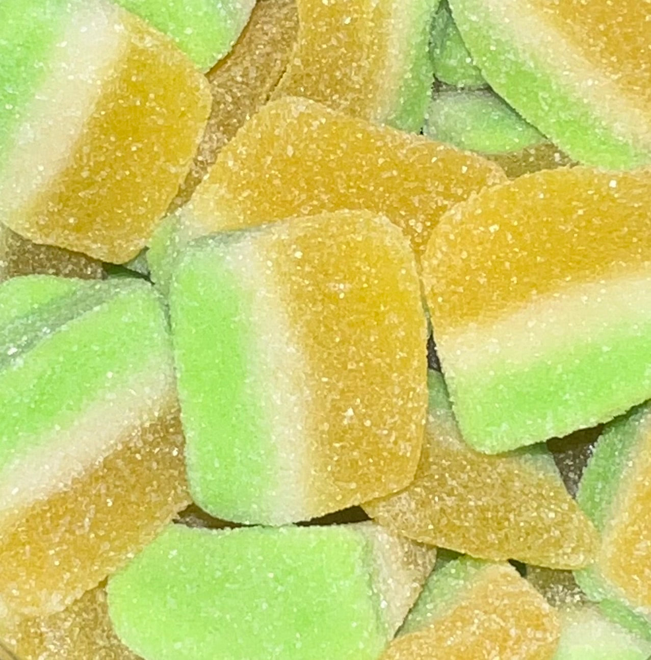 Ingrédients : sirop de glucose, sucre, eau, amidon modifié de pomme de terre, gélatine, acidifiants : E330, E296, E270, arômes, colorants : E102, E104, E110, E122, E124, E129.